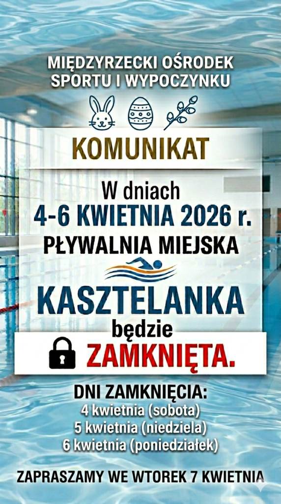 W dniach 4-6 kwietnia 2026 r. Pływalnia Miejska “Kasztelanka” będzie ZAMKNIĘTA.